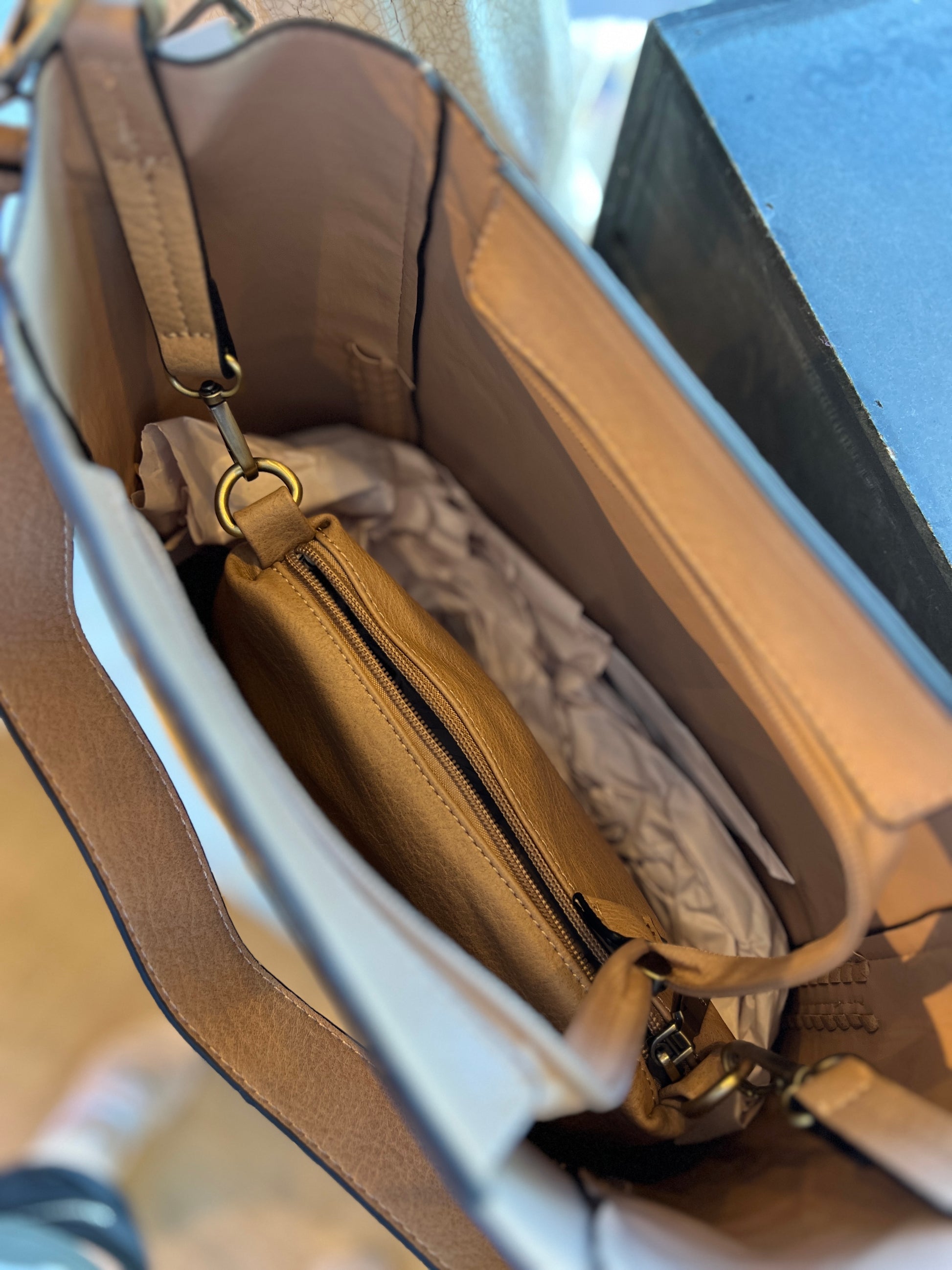 The Penny 2-in-1 Bucket Bag is a versatile accessory that combines style and functionality. Made with vegan leather, this bag features side braided pockets and an adjustable/removable guitar strap for added convenience. With an inside bag and pockets, it offers ample storage space for your essentials. Dimensions are 11" L x 12" H x 3.5" D. Upgrade your everyday look with this must-have bag.